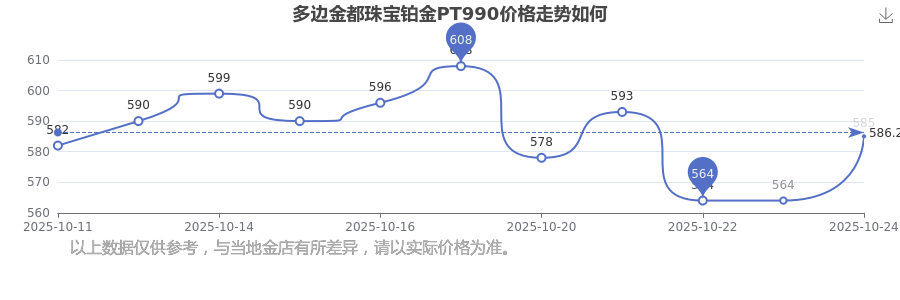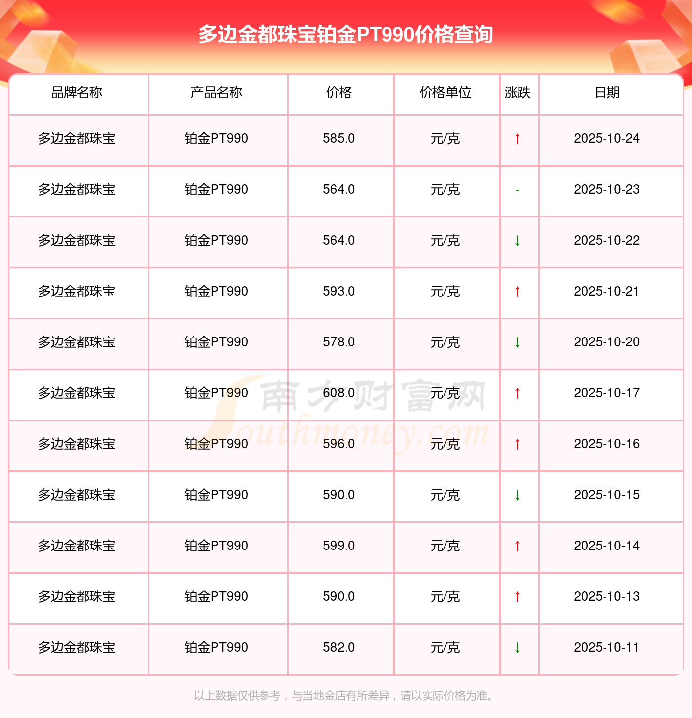 今天(2025年10月26日)多边金都珠宝铂金PT990的价格为585.0元/克。